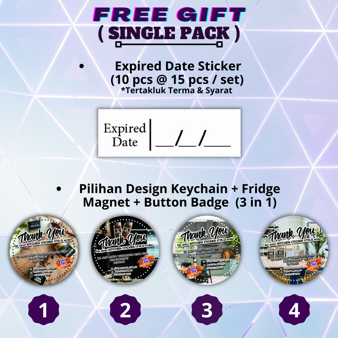 Beli Pakej Single Pack pun dapat hadiah banyak macam ini, memang anda tak rugi lah beli label stiker dapur dengan Kitchen Sticker Stylo.