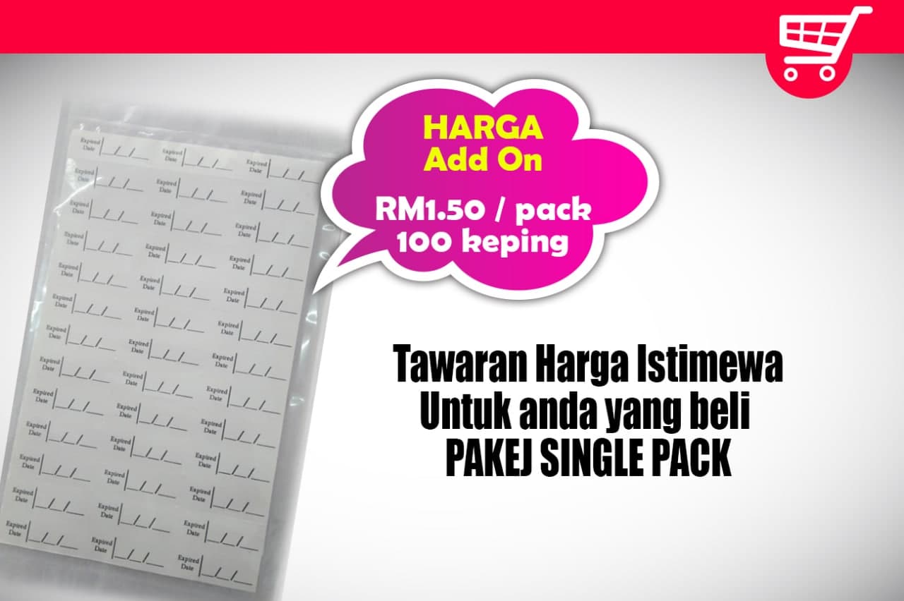 Tawaran ini hanya untuk anda yang beli Pakej Single Pack sahaja. Kalau tak beli Pakej Single Pack, boleh juga nak beli Add On Expired Date Sticker ni. Cuma harganya tak dapat harga special lah...