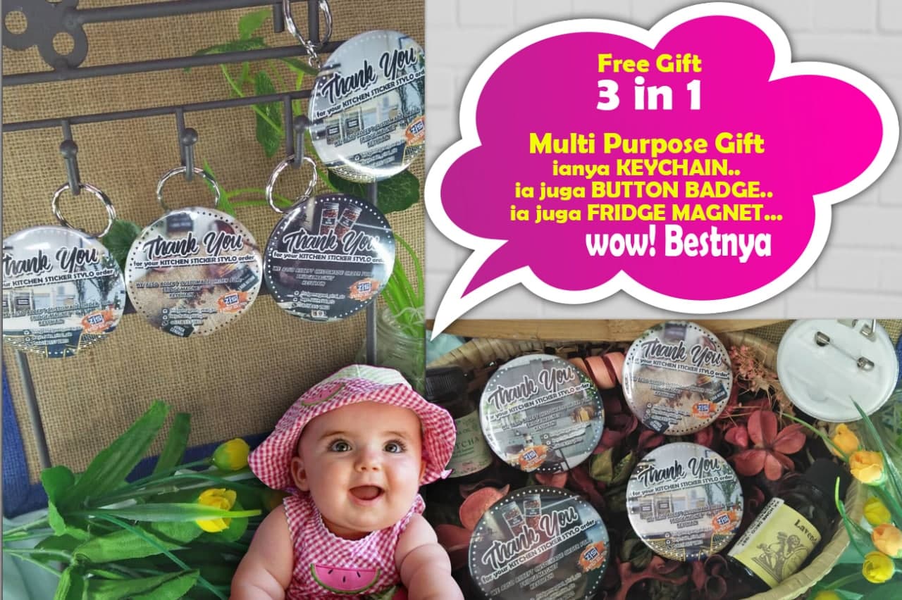 Ooh semestinya tidak.. kami juga hadiahkan dengan (3 in 1) gift Keychain + Fridge Magnet + Button Badge untuk anda yang tersayang. Bestkan dapat banyak hadiah dari Kitchen Sticker Stylo.